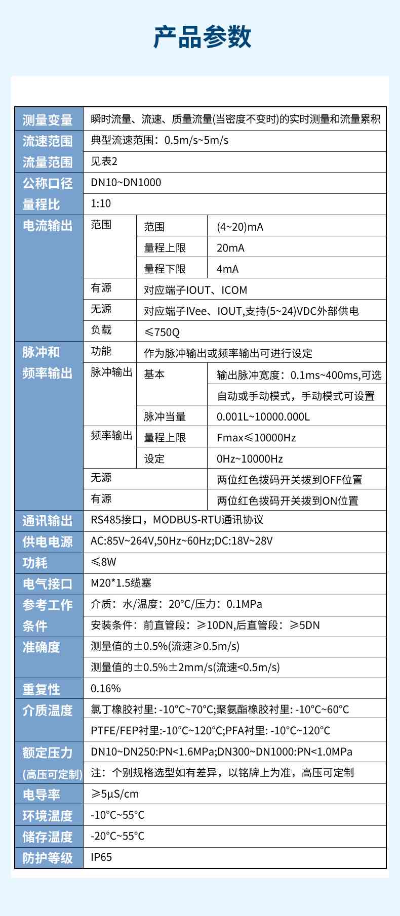 產(chǎn)品描述:電磁流量計基于法拉第電磁感應(yīng)原理設(shè)計,用于直接測量封閉管道內(nèi)導(dǎo)電液體的瞬時流量,并具有流量累積功能。在進行現(xiàn)場監(jiān)測顯示的同時,可輸出標(biāo)準(zhǔn)的電流信號、脈沖信號和 RS485 數(shù)字信號,供記錄、調(diào)節(jié)、控制使用,實現(xiàn)檢測自動控制。可廣泛應(yīng)用于自來水、化工、煤