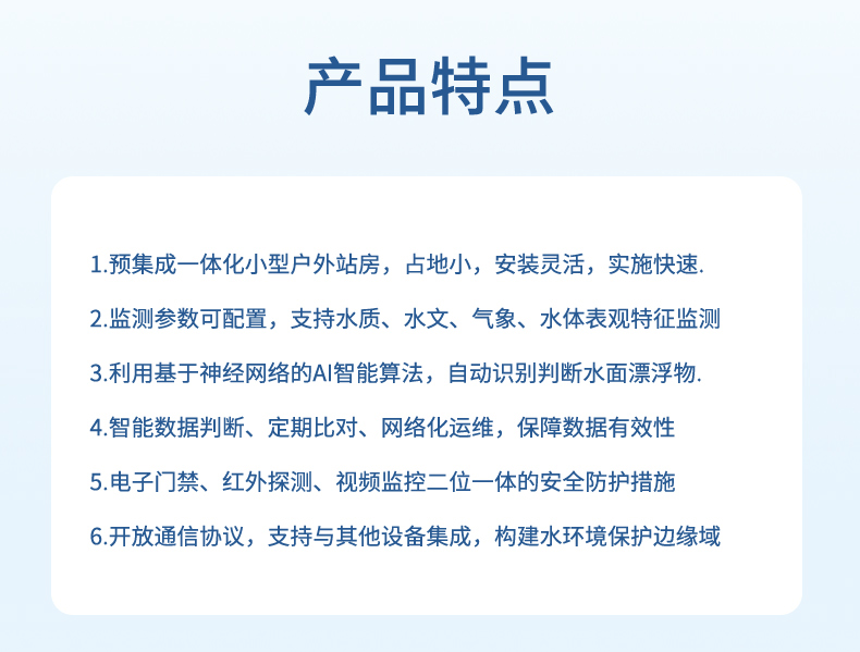產品描述:為便捷監(jiān)測水環(huán)境,iWater X-MiniStation小型水站采用預集成一體化微型戶外機柜設計,包括采水系統(tǒng)、預處理配水系統(tǒng)、分析儀器系統(tǒng)、輔助系統(tǒng)、安防系統(tǒng)、控制與數(shù)據服務系統(tǒng)、Al智能分析系統(tǒng)、集成機柜等,具有0.5平方米、1平方米、2平方米等規(guī)格,可實現(xiàn)水質、水文、氣象等參數(shù)的自動測量,以及水面漂浮物的識別,并進行結構化、非結構化數(shù)據的管理與服務。依據流域河網水系特點,在河道采用iWater X-MiniStation系列微型水站進行網格化布點監(jiān)控,結合信息化技術,以大數(shù)據支撐水環(huán)境評價與預警、