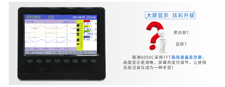 產品名稱:聯測_SIN-R6000C/4000C_1~48路可選_7英寸寬屏_彩色/藍屏_記錄溫度/壓力/電流/電壓/頻率多種參數