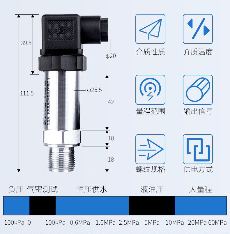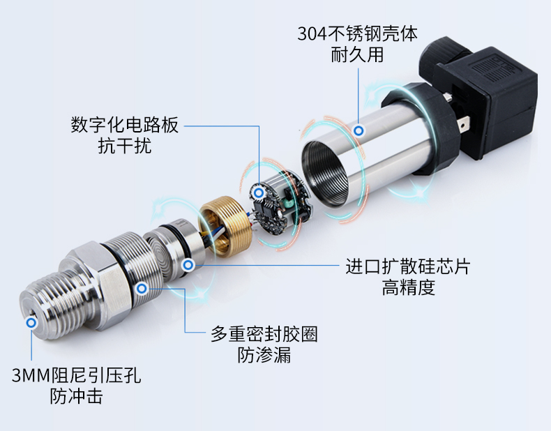 產(chǎn)品描述:擴(kuò)散硅壓力變送器選用進(jìn)口高精度、高穩(wěn)定性壓力 敏感芯片。敏感芯片采用先進(jìn)的微機(jī)械刻蝕加工工藝, 通過在硅片上擴(kuò)散四個(gè)高精度電阻,從而形成惠斯通電 橋。由于壓阻效應(yīng),四個(gè)橋臂電阻的阻值發(fā)生變化,電 橋失衡,敏感元件輸出一個(gè)對應(yīng)壓力變化的電信號。輸 出的電信號通過放大和非線性矯正電路的補(bǔ)償,產(chǎn)生與 輸入壓力成線性對應(yīng)關(guān)系的電壓、電流信號。