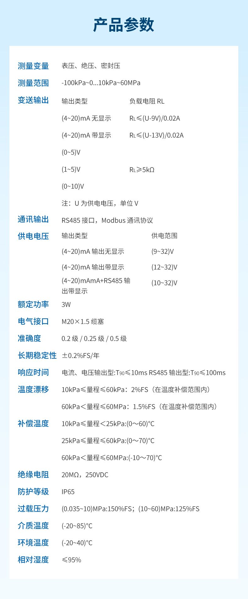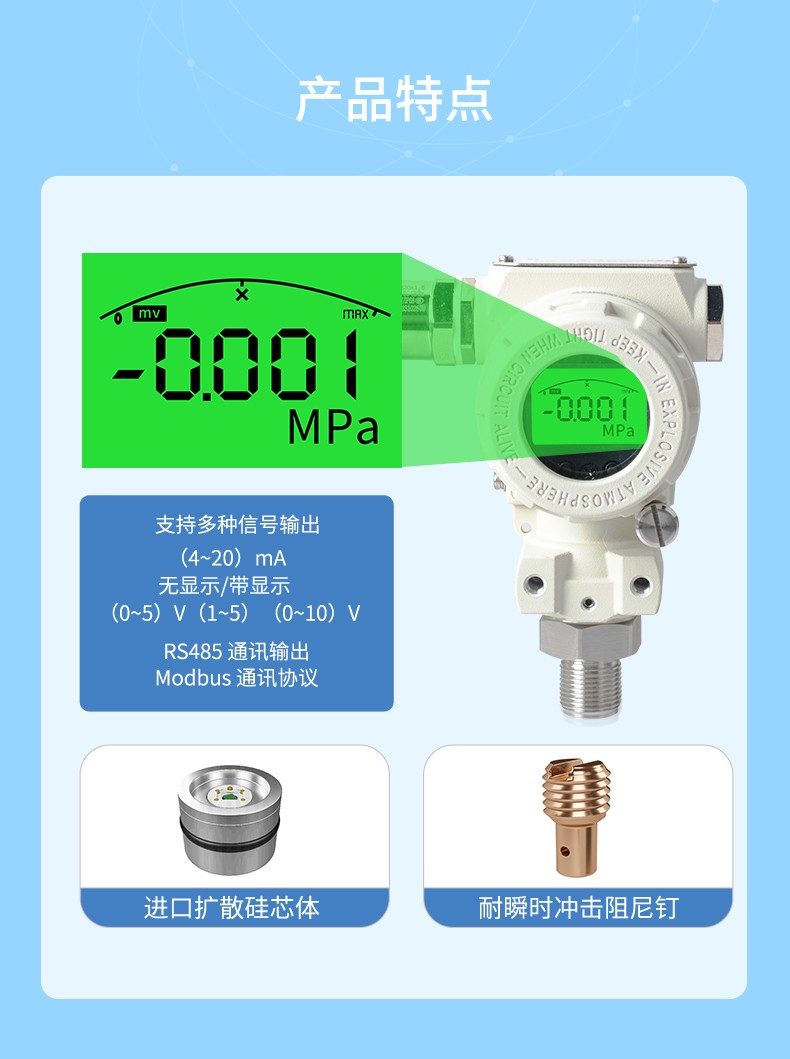 產品描述: 壓力變送器選用進口高精度、高穩定性的擴散硅芯體,傳感器內采用電子放大器組成,將測量的電信號轉換成標準信號(電流、電壓、RS485)輸出??梢灾苯优c計算機接口卡、控制儀表、智能儀表或 PLC 等方便相連。