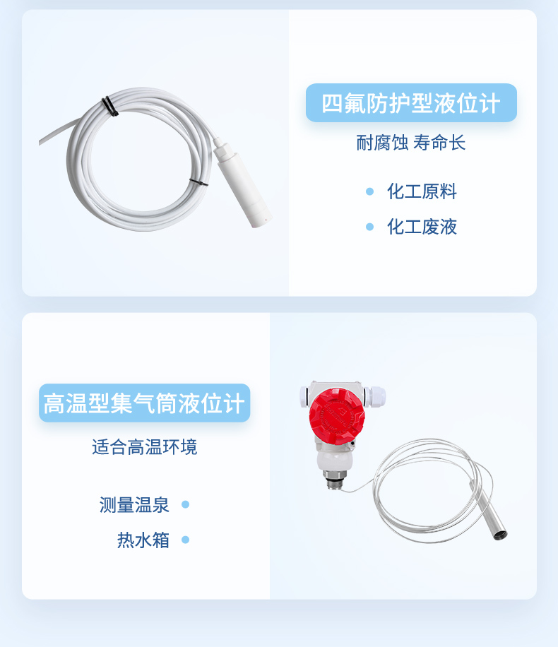 產品描述:防腐投入式液位變送器由高性能陶瓷壓力傳感器作為測量元件,把與液位深度成正比的液體靜壓力準確的測量出來,并經過信號調理電路轉換成標準的電流、電壓或 RS485 信號輸出,建立起輸出信號與液位深度的線性對應關系,實現對液體深度的測量。產品采用聚四氟乙烯防腐材質,具有優良的耐腐蝕性能,廣泛適用于化工廠酸、堿性等腐蝕介質的液位測量。